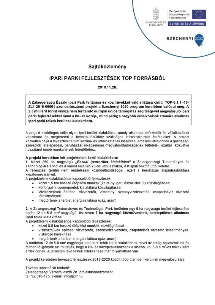 Zalaegerszeg Északi Ipari Park feltárása és közművekkel való ellátása